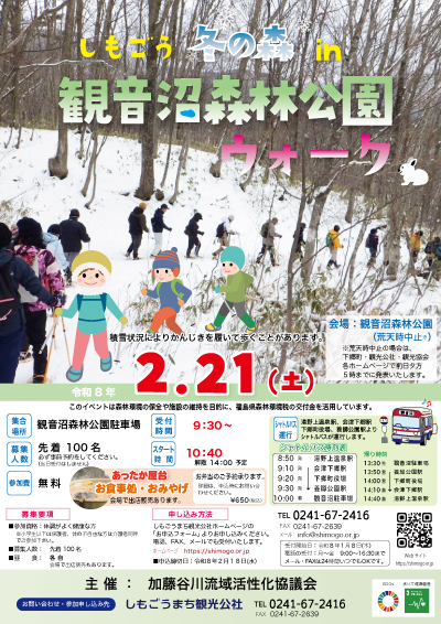2月21日(土)「しもごう 冬の森 in 観音沼森林公園ウォーク」 開催 2026年1月4日 最終更新日時 : 2026年1月7日 goma 令和8年2月21日(土)「しもごう冬の森 in 観音沼森林公園ウォーク」を開催します。 雪深い冬の観音沼を歩くウォーキング大会です。(雪が深い場合はかんじきを履いて歩きます。)観音沼の外周を回る「沼一周コース」や、小高い山を登り見晴台まで歩く「見晴台コース」の2コースを歩きます。 1/8(木)よりネット先行予約開始! 申し込みフォーム BlueskyCopy